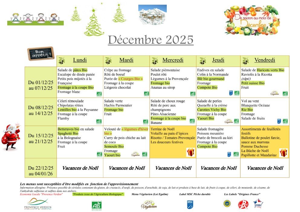 MENU CANTINE DÉCEMBRE