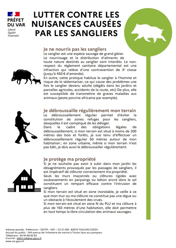 " Depuis une quinzaine d'années, tous les moyens réglementaires ouverts dans le cadre national sont mis en oeuvre dans le département du Var en ce qui concerne l'ouverture de la chasse au sanglier, qui peut être pratiquée jusqu'à dix mois de l'année dans le respect de la réglementation :