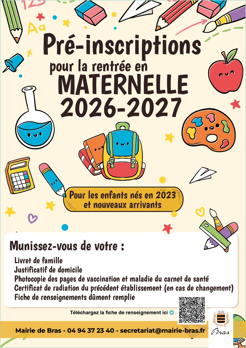 Les pré-inscriptions pour la rentrée en maternelle à l’école primaire de Bras sont désormais ouvertes.
