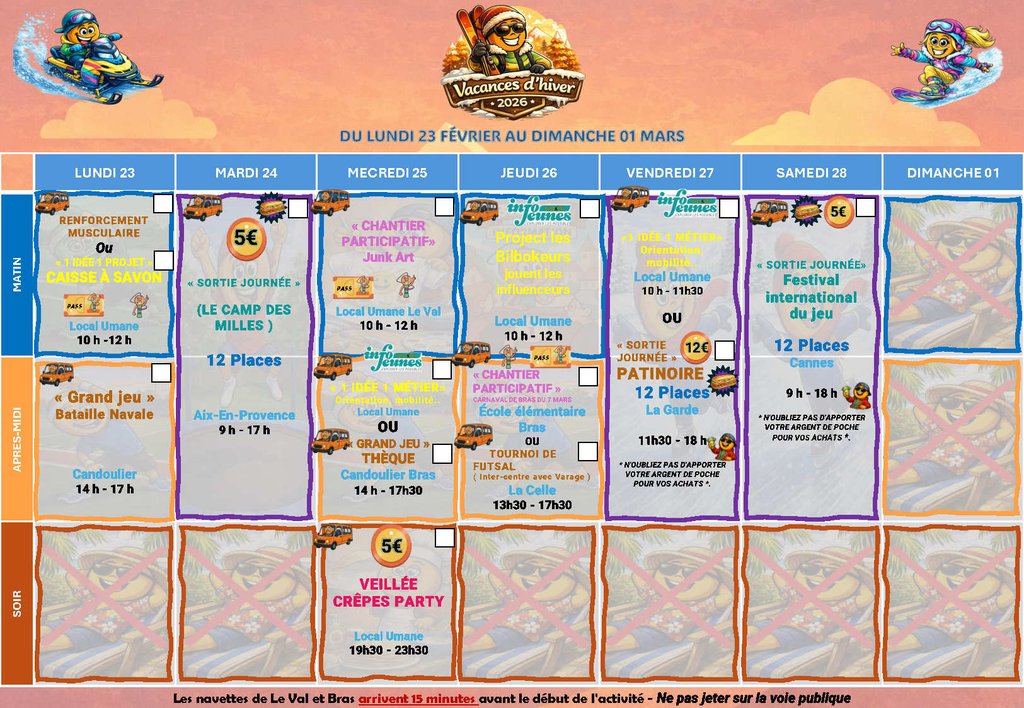 - Sorties journée (raquettes, patinoire, festival du jeu…)
