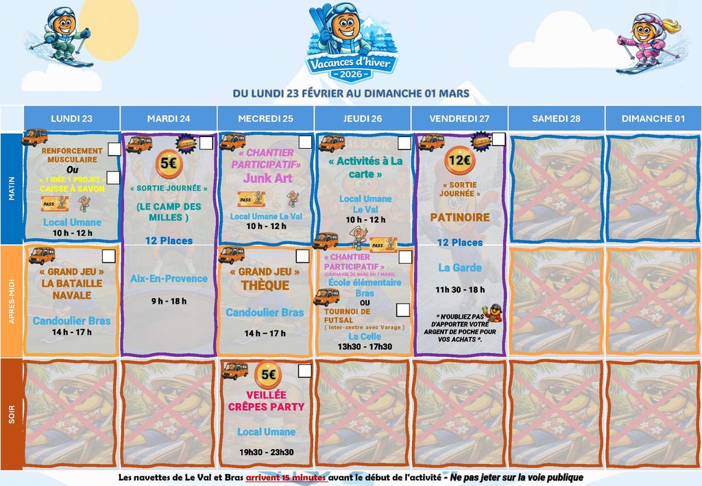Certaines activités sont payantes (tarifs indiqués sur le planning)