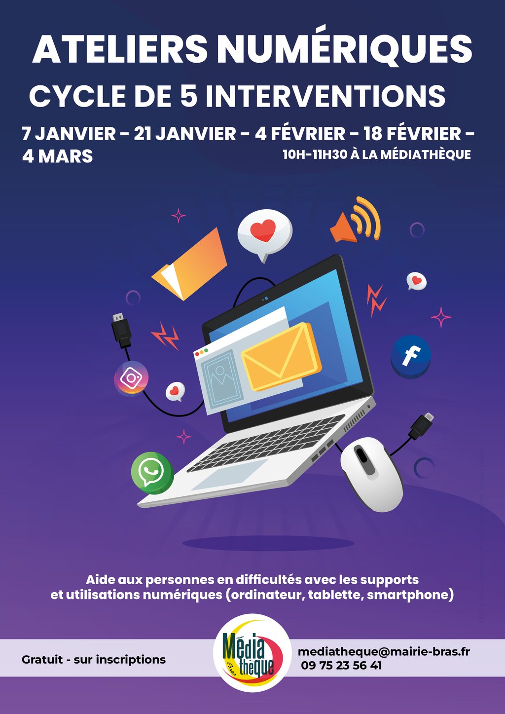 La Médiathèque de Bras vous propose un cycle de 5 ateliers numériques pour aider les personnes en difficultés avec les supports et utilisations numériques (ordinateur, tablette et smartphone).