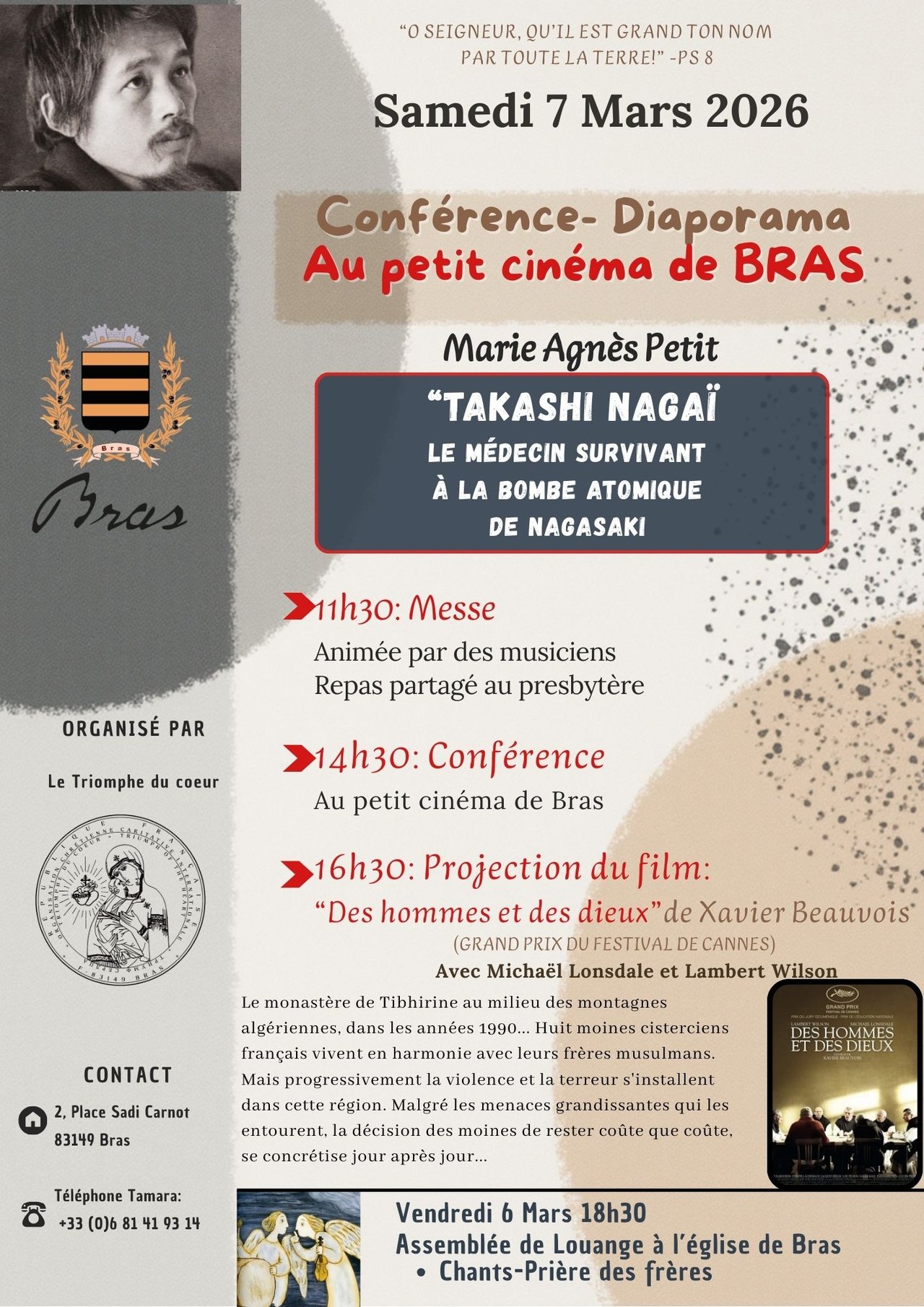 - 7 mars : Odile Deshors (ND de Vie) : "Takashi Nagaï", médecin survivant de Nagasaki et sa femme Midori, avec l'exposition qui leur est consacrée. Un témoignage de vie qui interroge chacun de nous sur la question de la paix...
