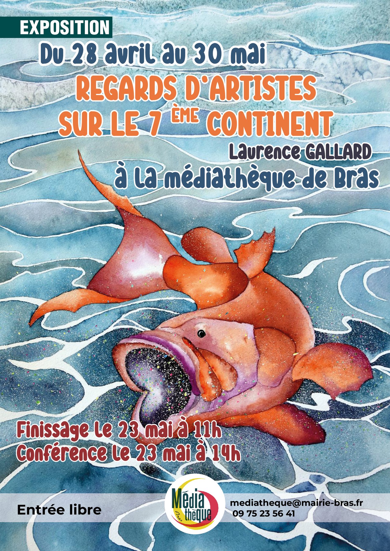 Le thème de l’exposition « Regards d’artistes sur le 7ème continent », réalisée par le collectif Lézex, est dans l’air du temps puisqu’il illustre la pollution plastique. Celle-ci compose 85% des déchets des océans, et représente un risque élevé pour la survie de la biodiversité planétaire.